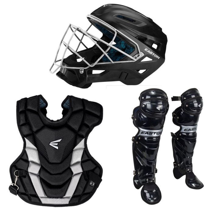 Easton’s® new Gametime™ Box Set includes a helmet, chest protector and leg guards. It is available in Adult, Intermediate and Youth sizes and is offered in 4 core color combinations to match your team’s colors. The intermediate set is recommended for players ages 13 to 15.