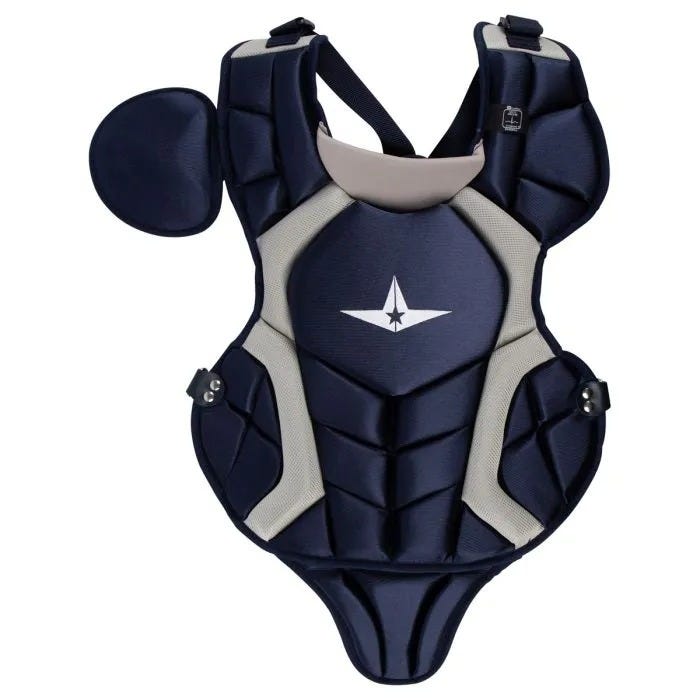- Recommended for high school and above, the All-Star System 7 Axis Pro Adult Chest Protector has a patent pending chest panel for improved protection. Plus, it has wedged abs for improved blocking and moldable PE plates in the shoulders and throat for added protection. The protector has a thinner, more form-fitting DeltaFlex harness and Diamond Vent Ports for weight reduction and breathability providing a more lightweight and comfortable fit. This chest protector is 16.5" measured from clavicle to naval and is Certified by SEI to meet NOCSAE standards for protection against commotio cordis.